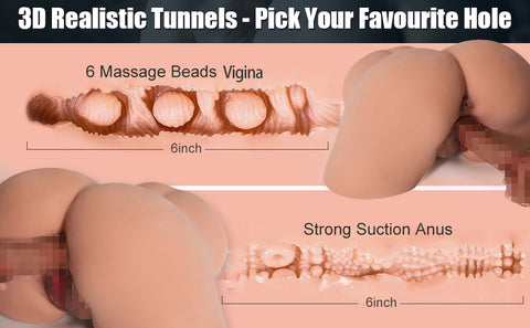 - 【Tight Vaginal and Anal Channels】This adult sex doll is designed with two separate tight vaginal anal channels. The soft vaginal wall is inlaid with 6 elastic large beads covered with lines that strongly squeeze your bro. Every twitch will show you how good the 6 beads massage your hard member one after another. Beads in anus are smaller than in the vagina. Both of the vagina and anus's insertable length is 6 inches.